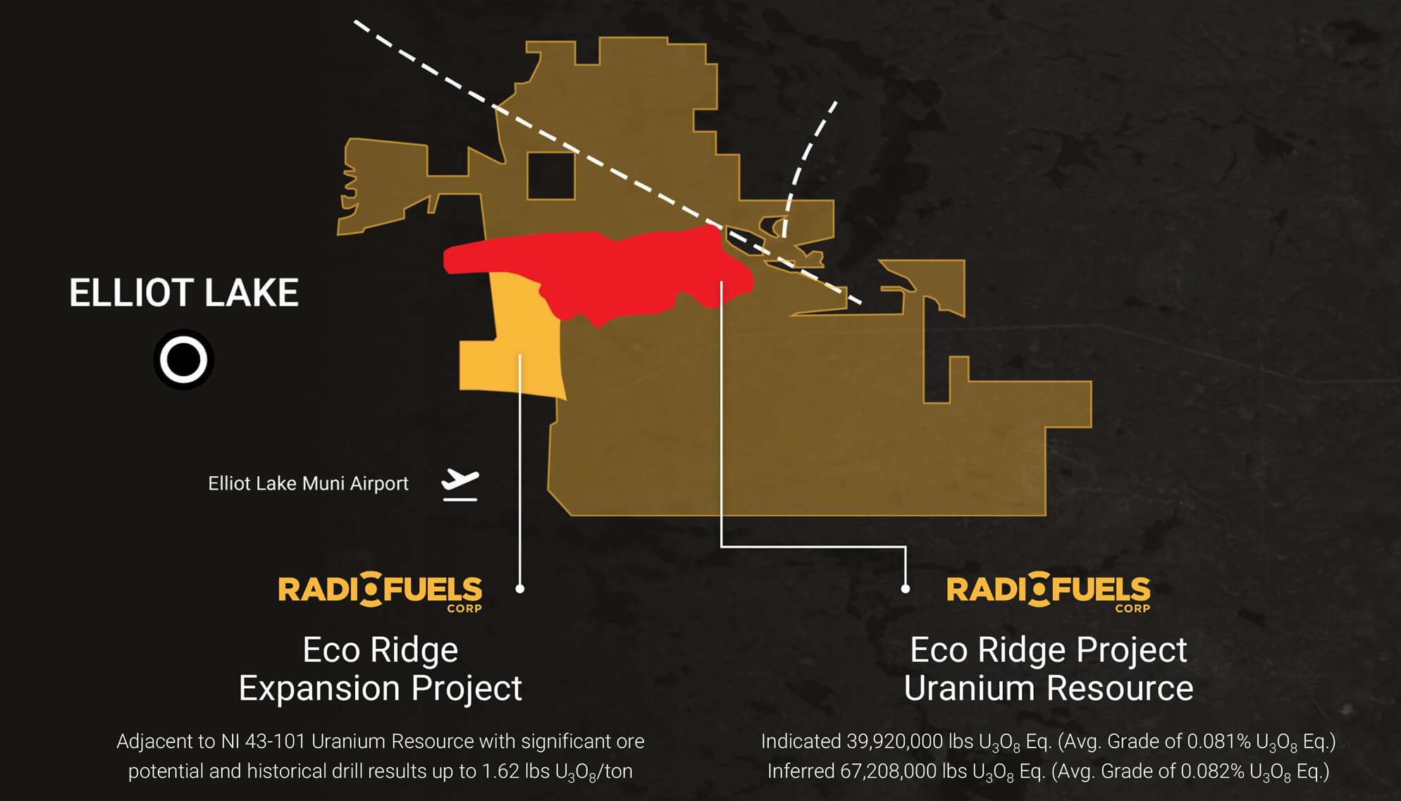 Radio Fuel’s flagship property is its 100-percent owned Eco Ridge Project located in Elliot Lake, where more than 300 million pounds of uranium oxide were mined from conglomerate beds by Rio Algom and Denison Mines from 1956 to 1996.